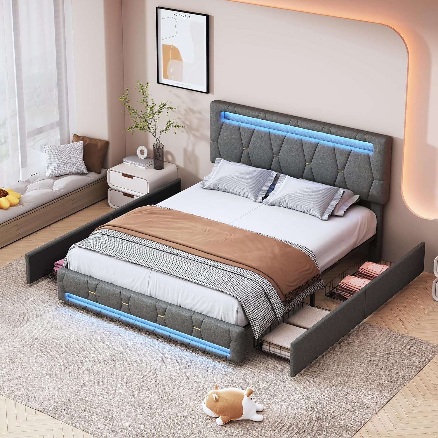 Tapecirani krevet 160 x 200 cm s LED-om, bračni krevet, krevet za odlaganje s letvičastim okvirom i 4 ladice, okvir kreveta s podesivim uzglavljem za odrasle i tinejdžere, bez madraca, platno siva