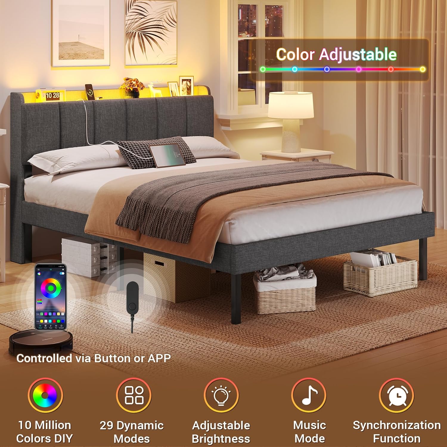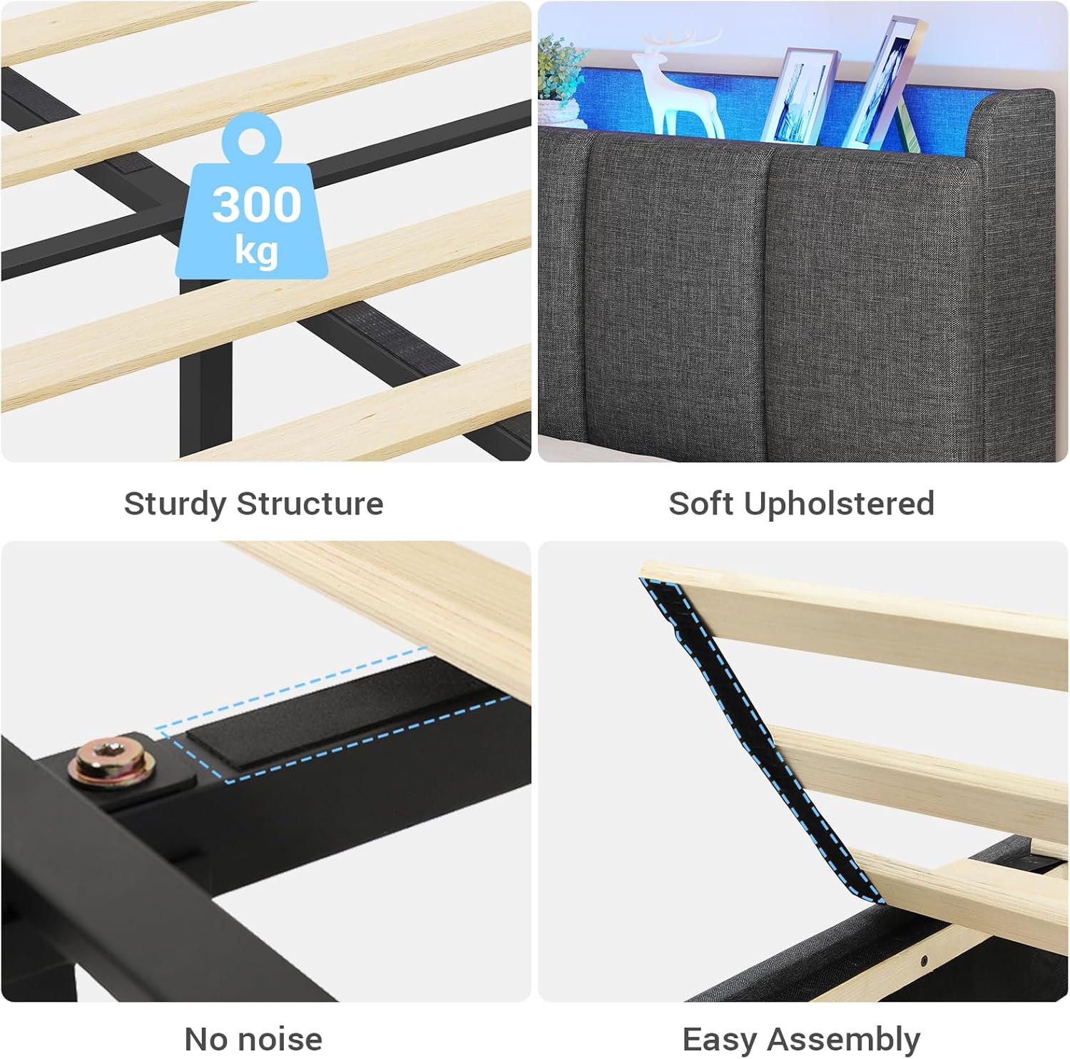 AOGLLATI tapecirani krevet 160 x 200 cm, okvir kreveta s LED rasvjetom i stanicom za punjenje, okvir kreveta s letvičastom podnicom, krevet za mlade, bračni krevet s lanenim uzglavljem, tamnosiva.