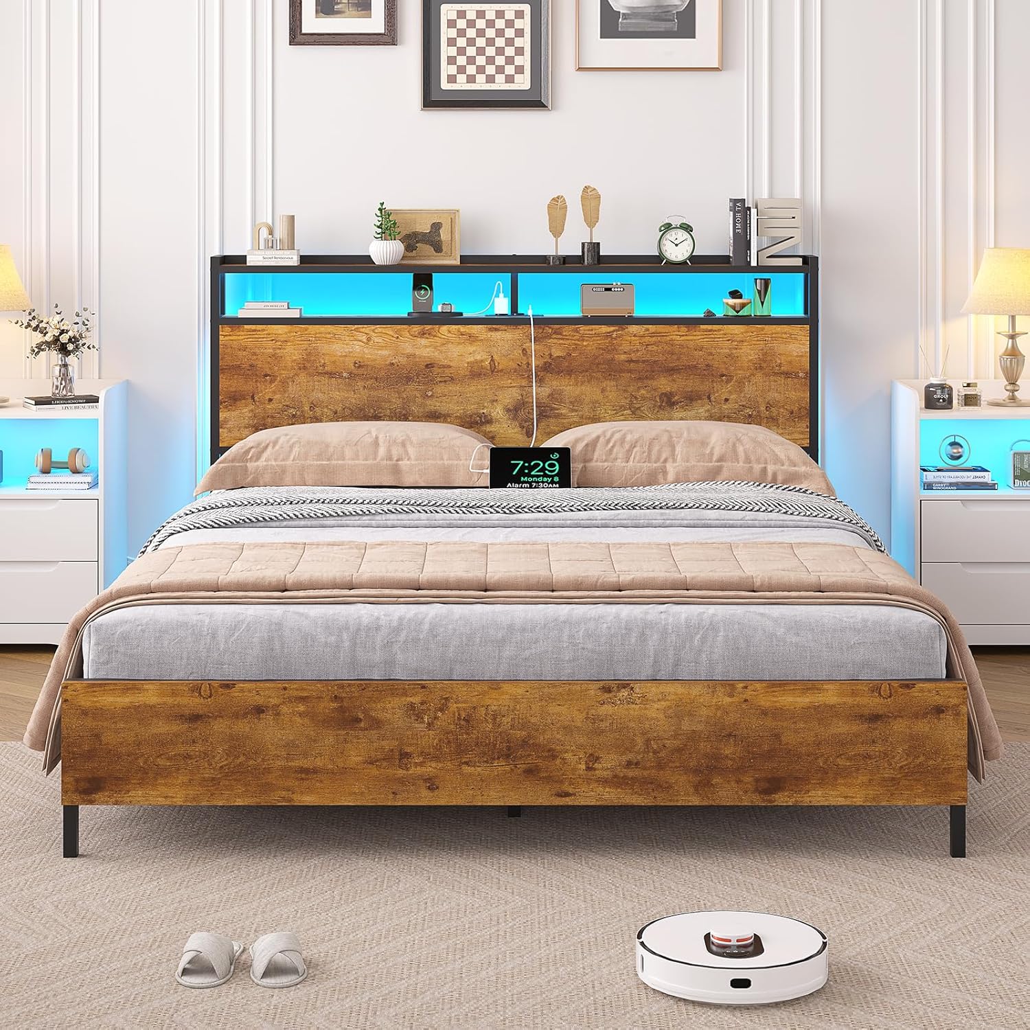 Brinlawb krevet 120 x 200 cm s metalnim rešetkastim okvirom, okvir kreveta 120 x 200 cm s LED rasvjetom, metalni krevet s uzglavljem i stanicom za punjenje (2 AC utičnice 2 USB priključka), moderan okvir kreveta za mlade, smeđa.