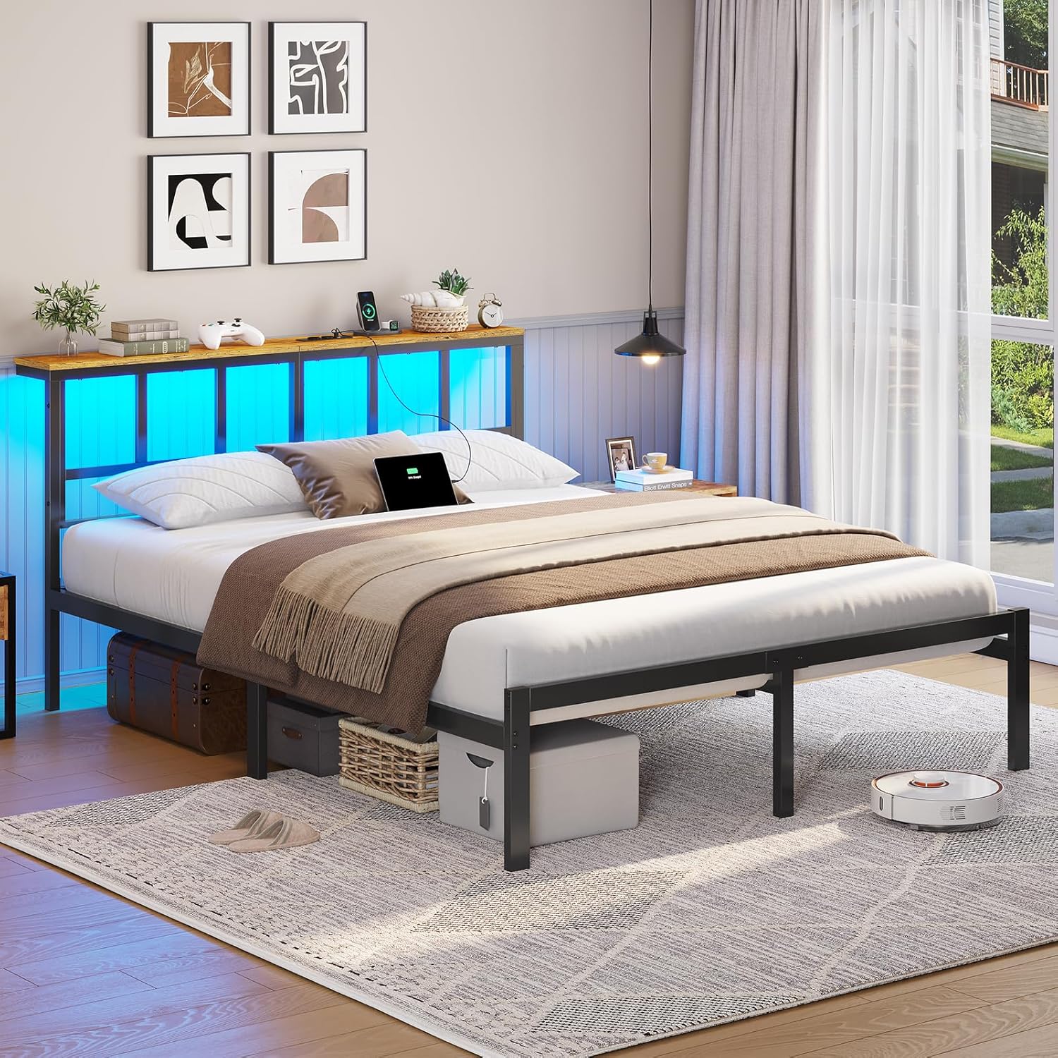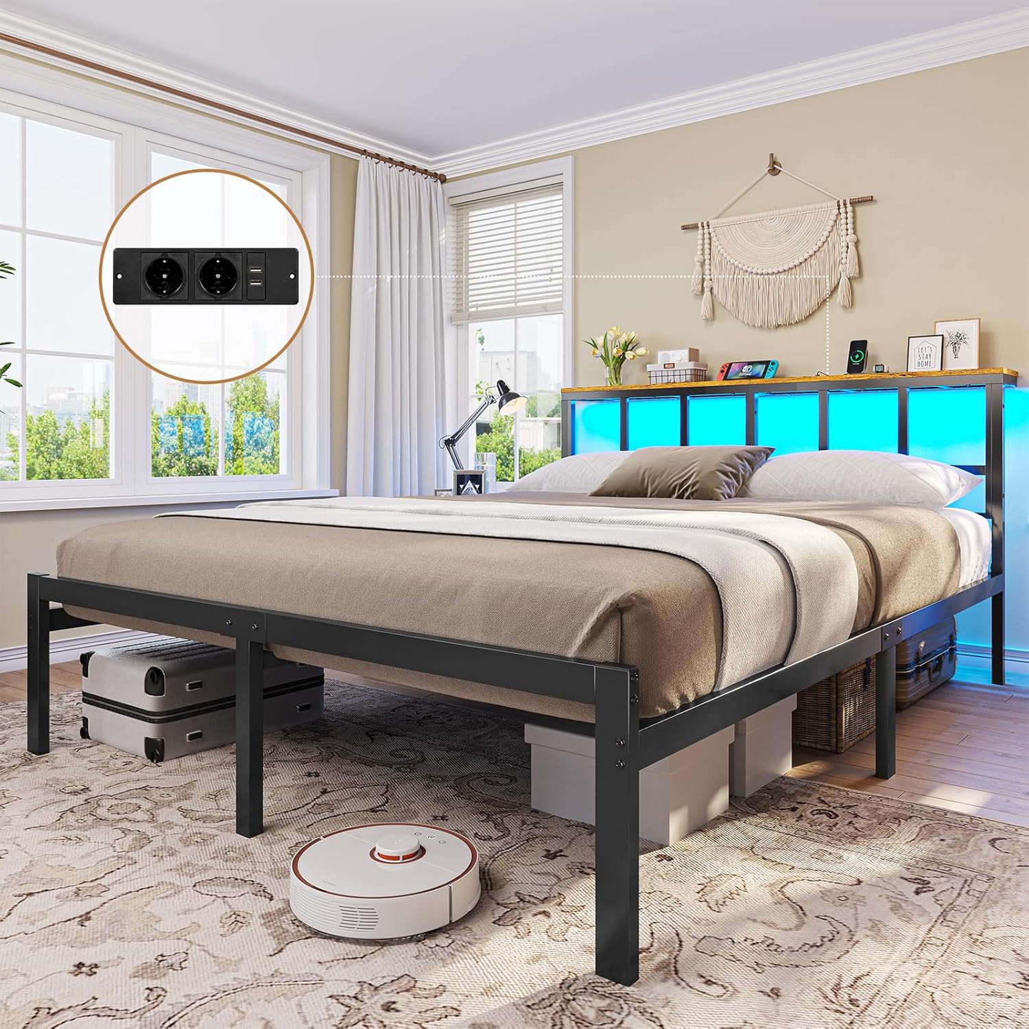 Brinlawb krevet 160 x 200 cm s metalnim rešetkastim okvirom, okvir kreveta 160 x 200 cm s LED rasvjetom, metalni krevet 160 x 200 cm s uzglavljem i stanicom za punjenje (2 AC utičnice i 2 USB priključka), krevet za mlade.