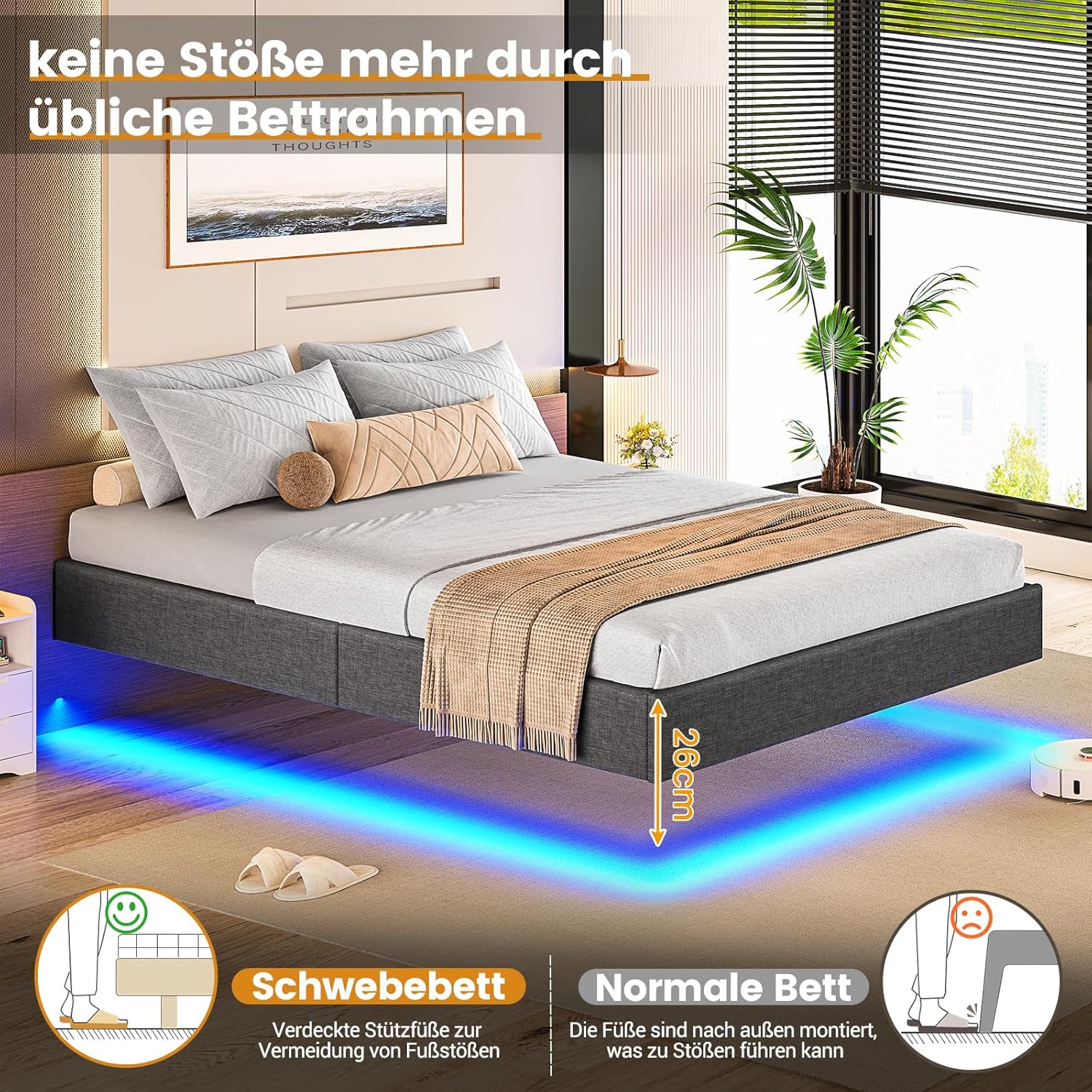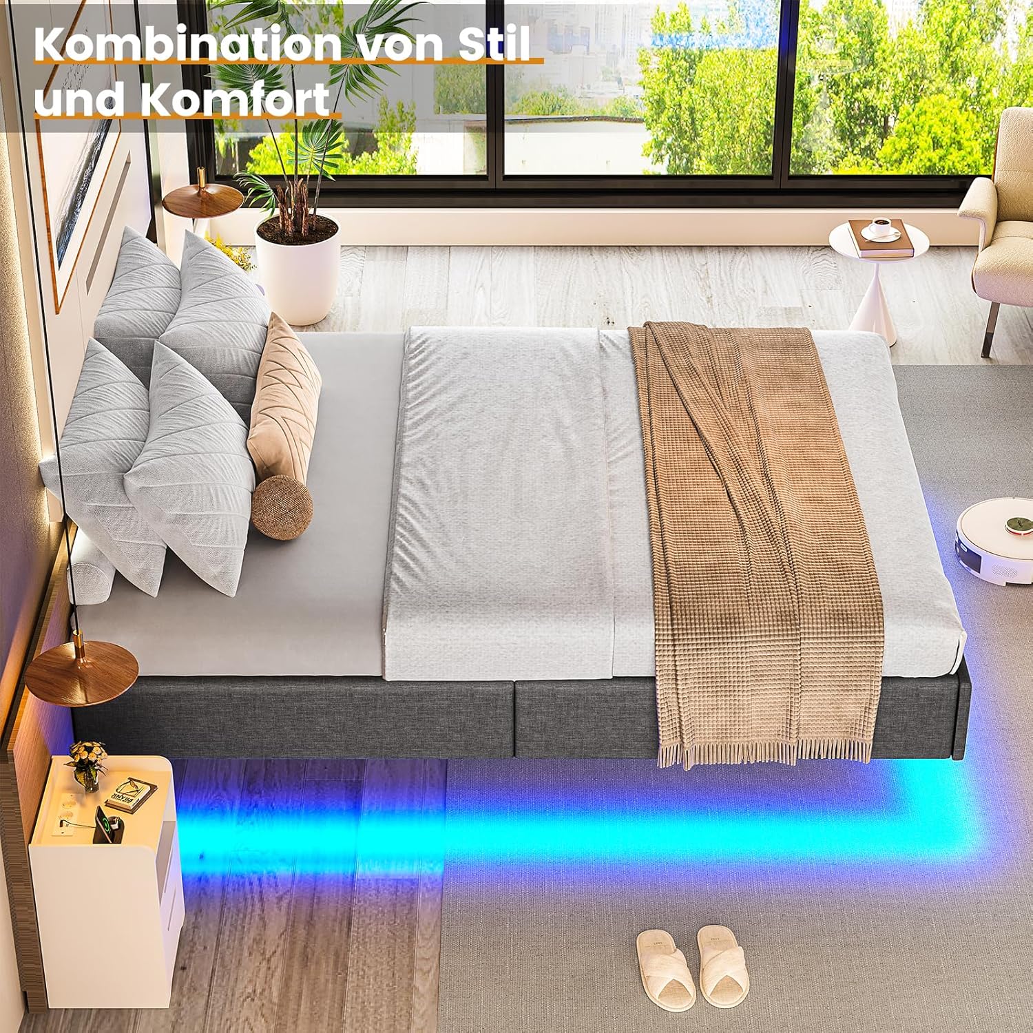 Brinlawb tapecirani krevet 180x 200 cm plutajući krevet s LED rasvjetom, uzglavljem i stanicom za punjenje