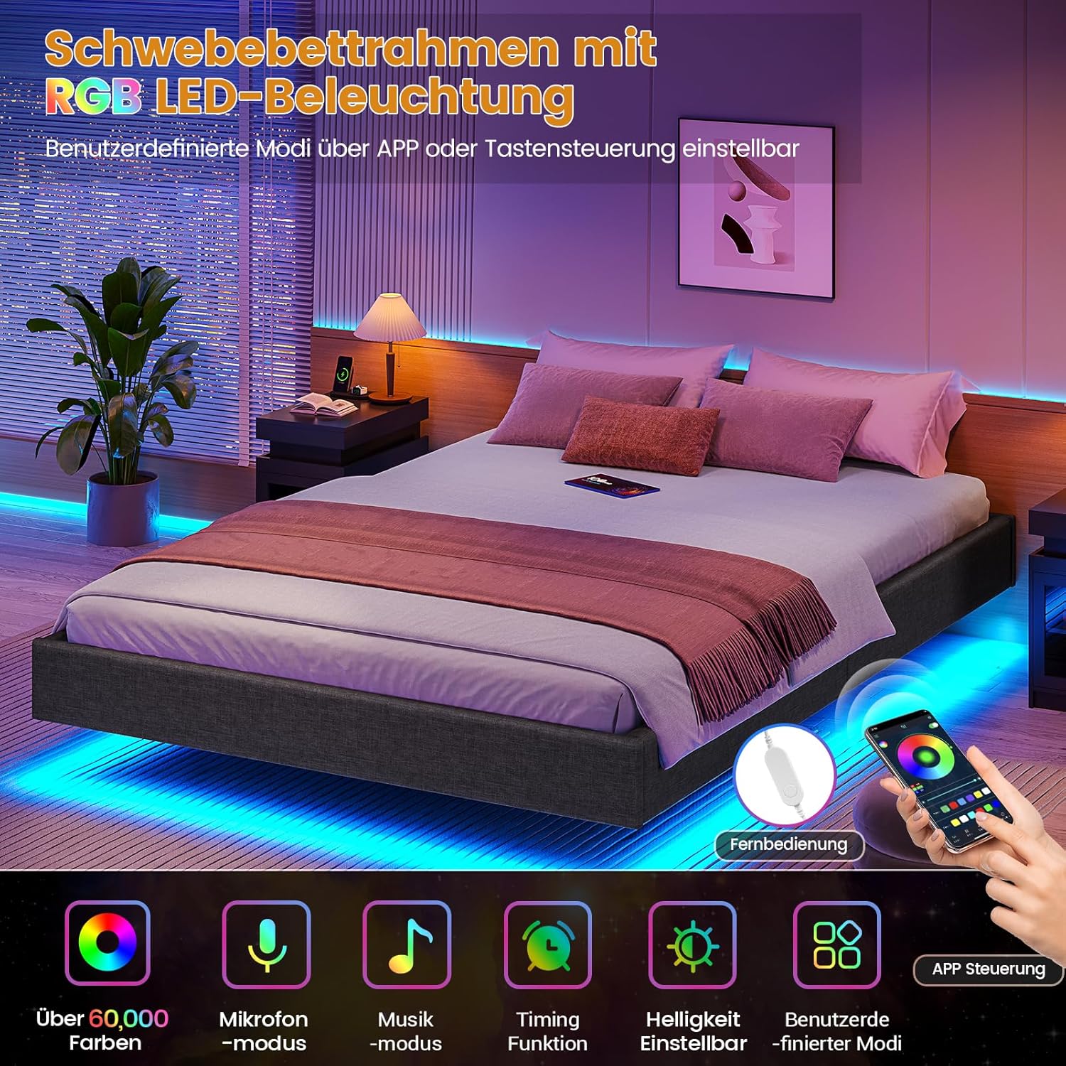 - LED rasvjeta s više načina: s krugom svjetlosnih traka na dnu sivog mladenačkog kreveta, možete stvoriti futuristički ambijent i zadovoljiti potrebu za noćnim svjetlom. Boje svjetla (više od 60.000 boja), svjetlina i način rada kao i kontrola vremena mogu se podesiti po želji putem aplikacije ili gumba. U glazbenom modu, boja i bljeskanje svjetla sinkronizirani su s ritmom glazbe, što može dovesti do jedinstvenog doživljaja.