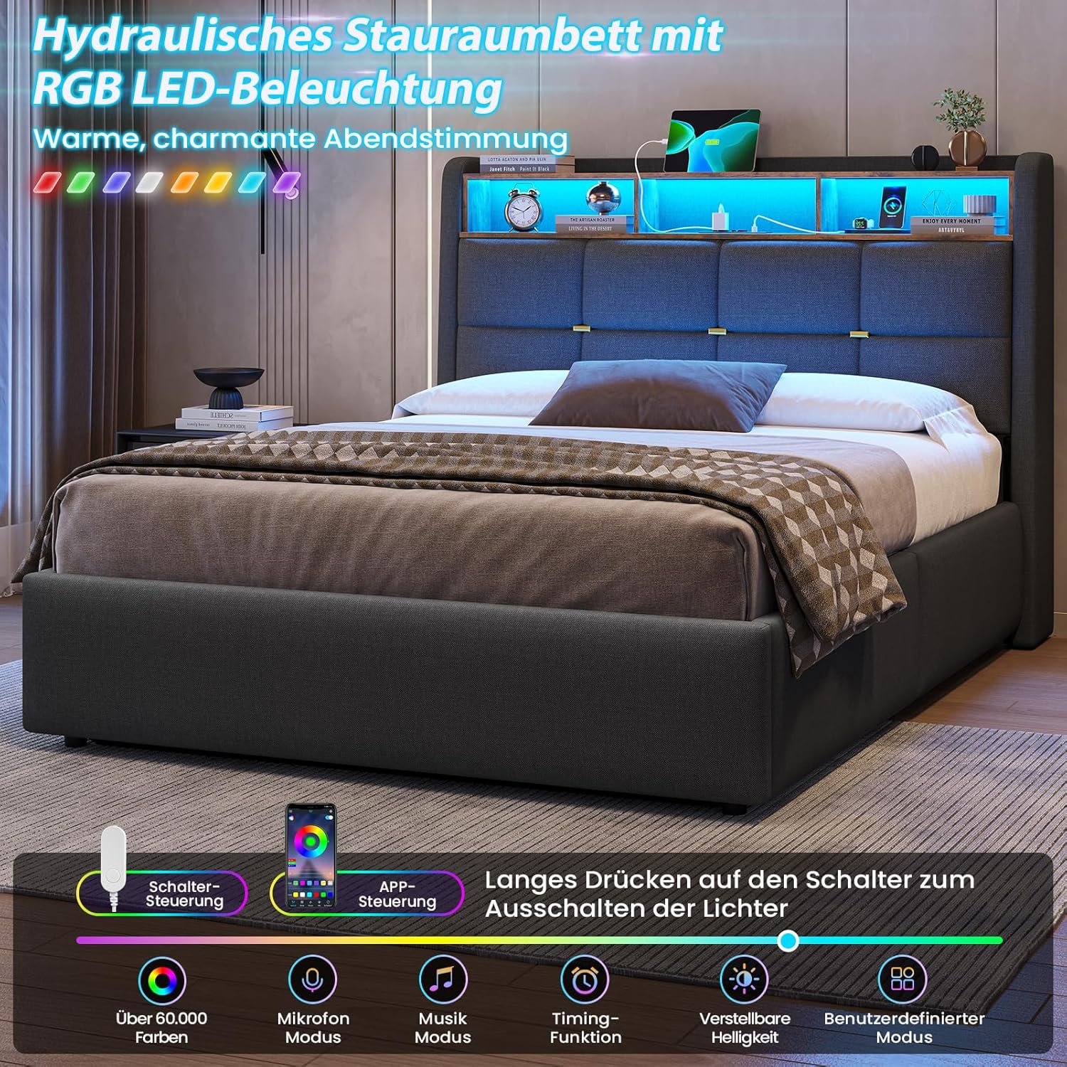 - Krevet s LED rasvjetom: okvir kreveta 160 x 200 živih LED svjetlosnih traka ima više od 60 000 boja, koje se mogu podešavati putem aplikacije ili prekidača. Svjetlina, dinamički način rada, sinkronizacija glazbe, način rada mikrofona i funkcija odbrojavanja također se mogu postaviti putem aplikacije za stvaranje sanjive, šarene atmosfere u spavaćoj sobi
