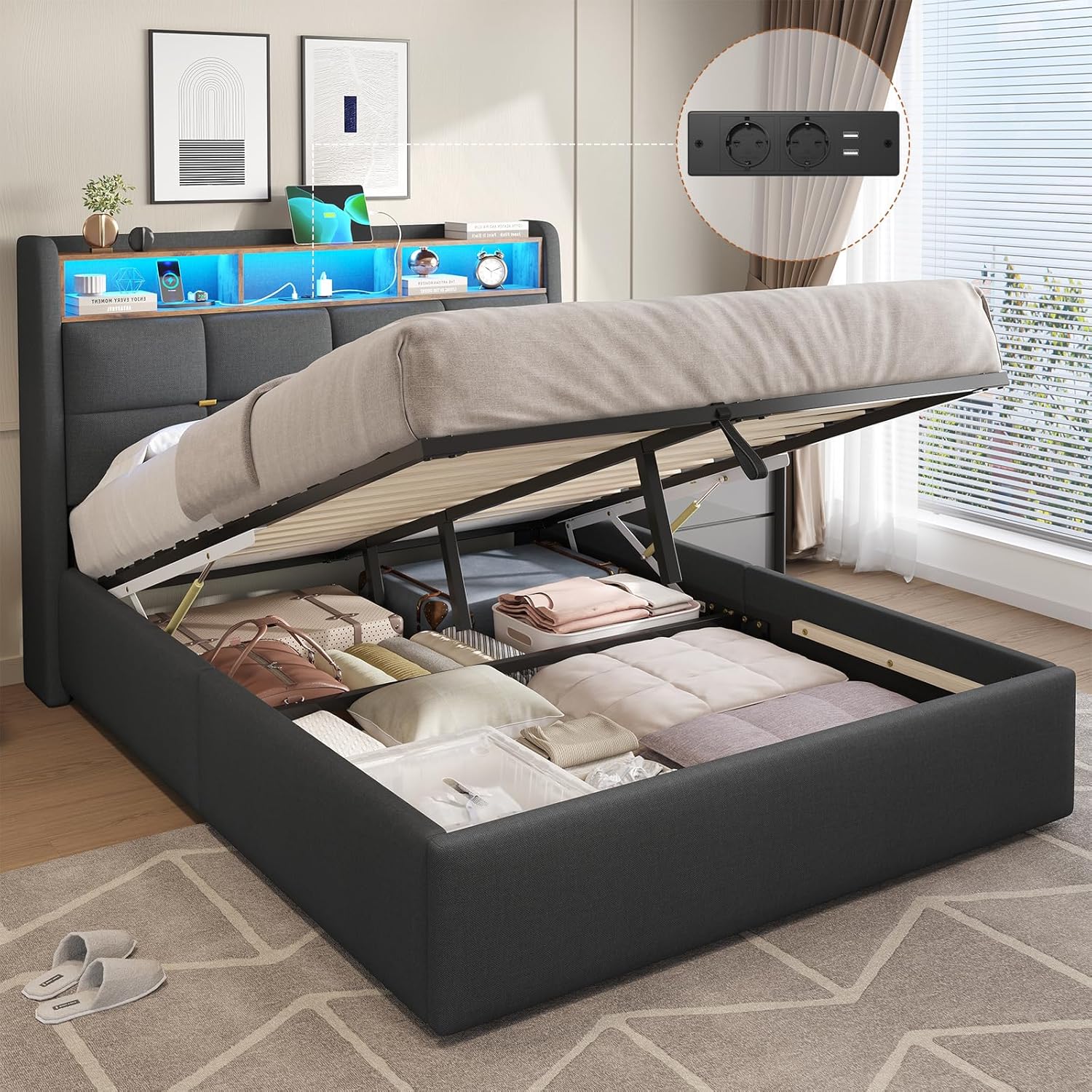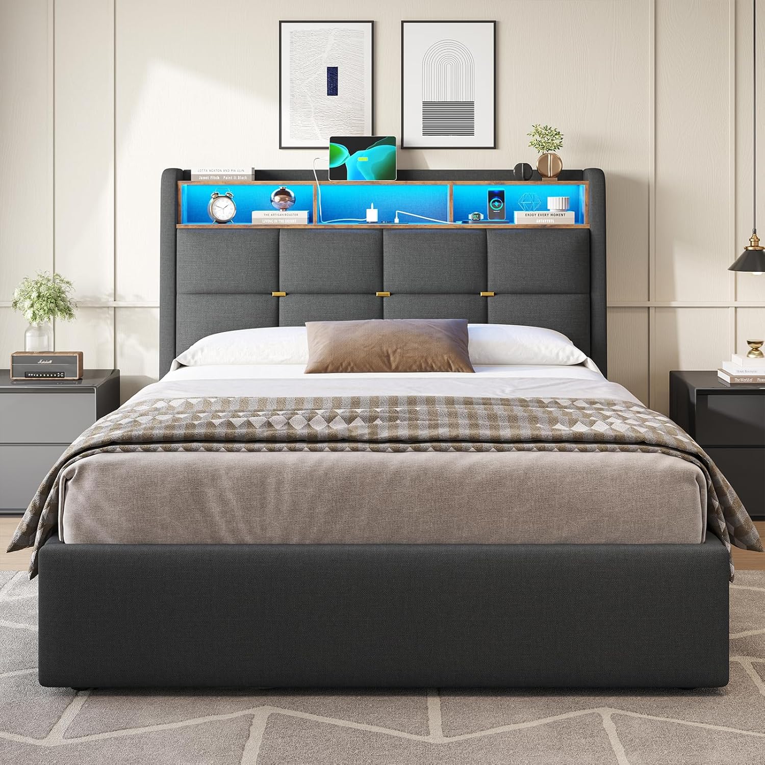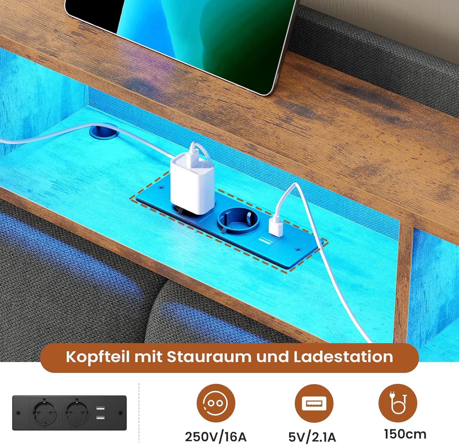 DICTAC Tapecirani krevet 160 x 200 cm s LED rasvjetom i strujnim razvodnikom, krevet za jednu osobu s letvičastim okvirom, okvir kreveta za odrasle s prostorom za pohranu, uzglavljem, USB priključcima i prostorom za pohranu, laneni okvir kreveta 160 x 200.
