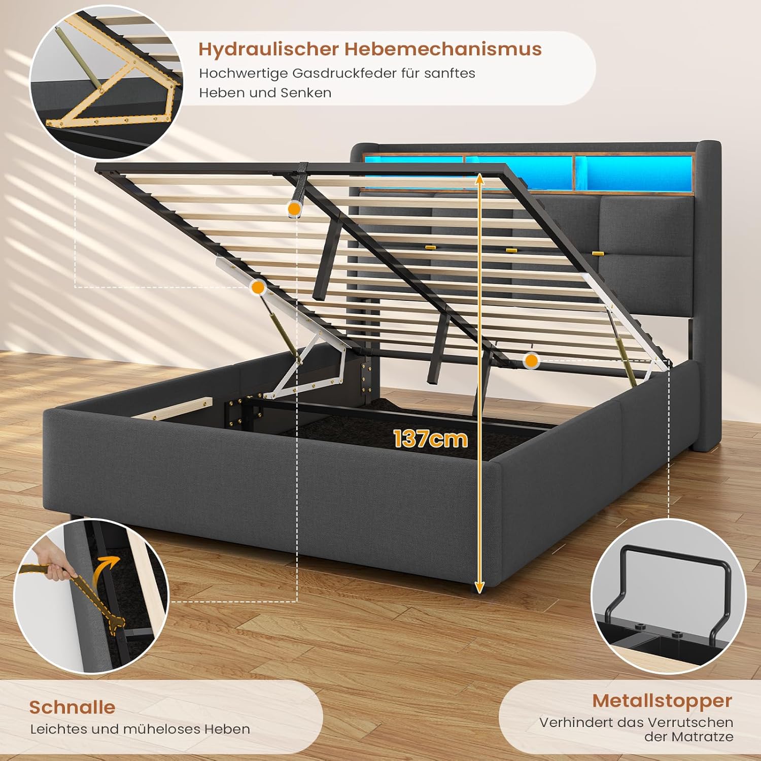 - Praktičan hidraulički krevet za odlaganje: zahvaljujući hidrauličnom plinskom podizaču, površina za ležanje može se lako podići. Prostor za pohranu visok 30 cm ispod obogaćuje spavaću sobu i idealan je za spremanje velikih, ali rijetko potrebnih predmeta kao što su kovčeg, torba za pohranu, sezonska odjeća, poplun itd. S 40% više prostora za pohranu od kreveta s ladicama, idealan je za male spavaće sobe ili stanove.