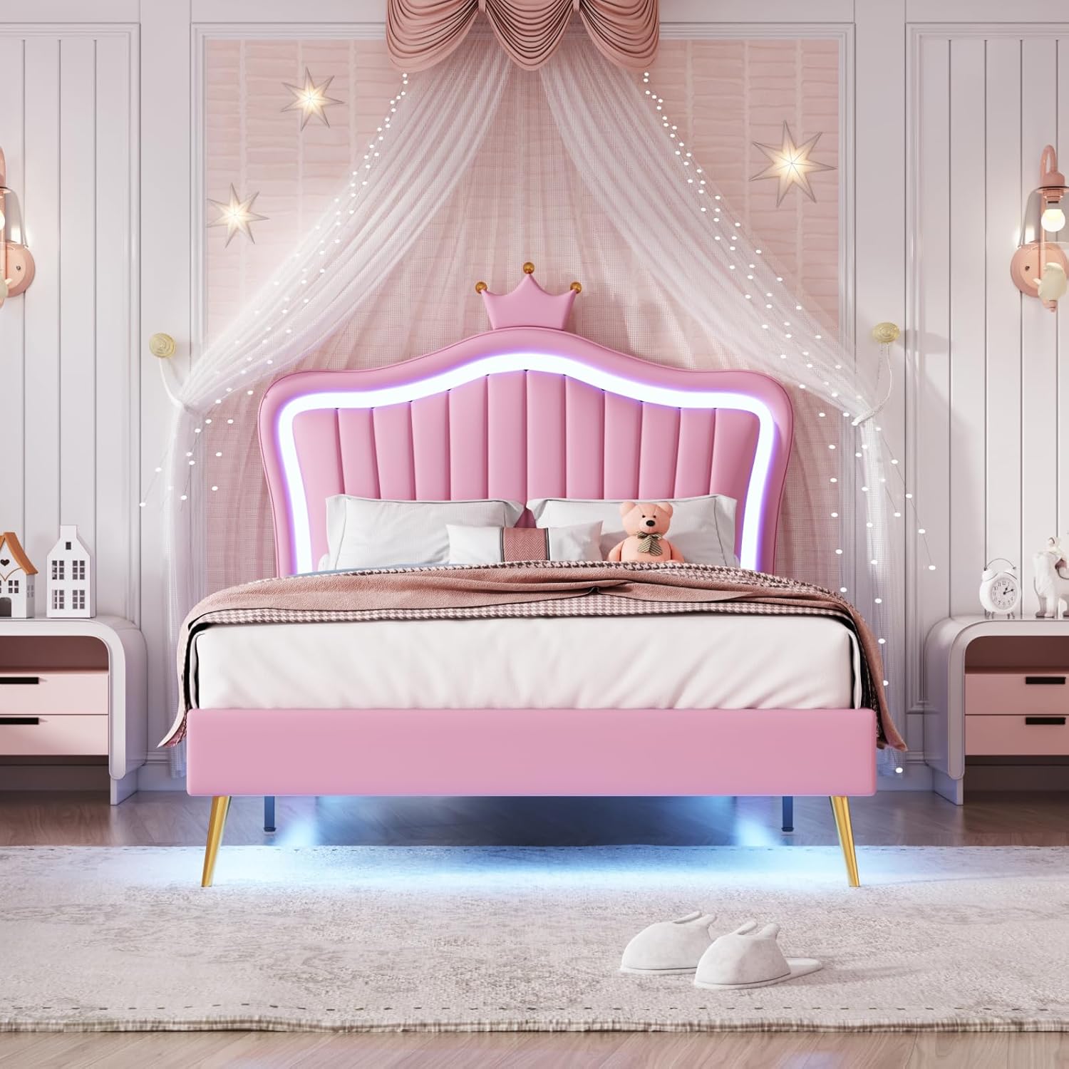 Dječji krevet 90 x 200 cm, Djevojački LED kreveti za jednu osobu, Okvir kreveta u obliku krune s podesivom visinom i letvičasti okvir.