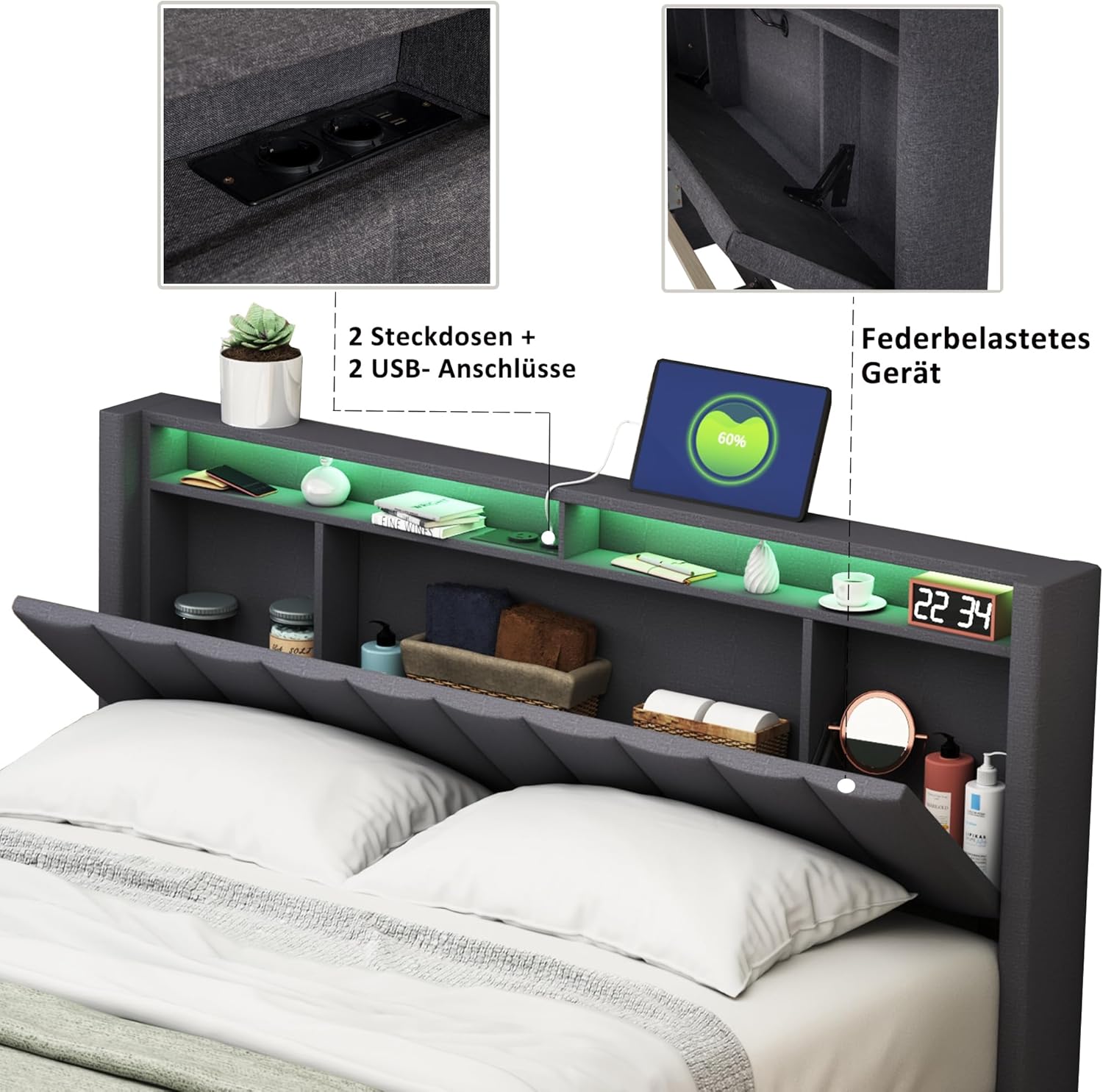 - S USB i Type-C priključcima: praktično uzglavlje s USB i Type-C priključcima za punjenje olakšava punjenje vaših mobilnih telefona i tableta prije spavanja bez ustajanja iz kreveta kako biste pronašli utičnicu.