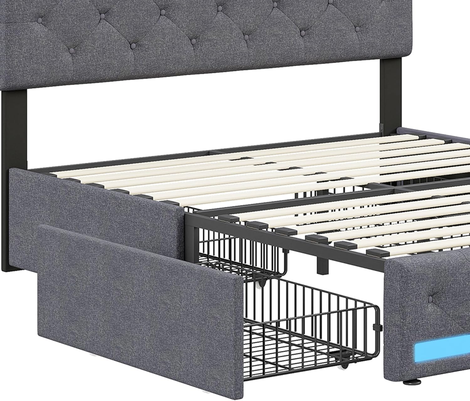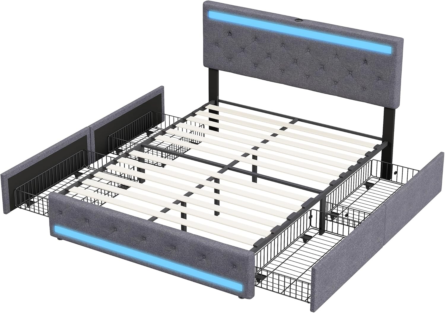 Tapecirani krevet ADFUNIT 180 x 200 cm s LED i USB-om, bračni krevet s 4 ladice, krevet s oprugama s prostorom za pohranu i letvičastim okvirom, krevet za mladenački krevet s naslonom za leđa, okvir kreveta, bez madraca, lanena siva.