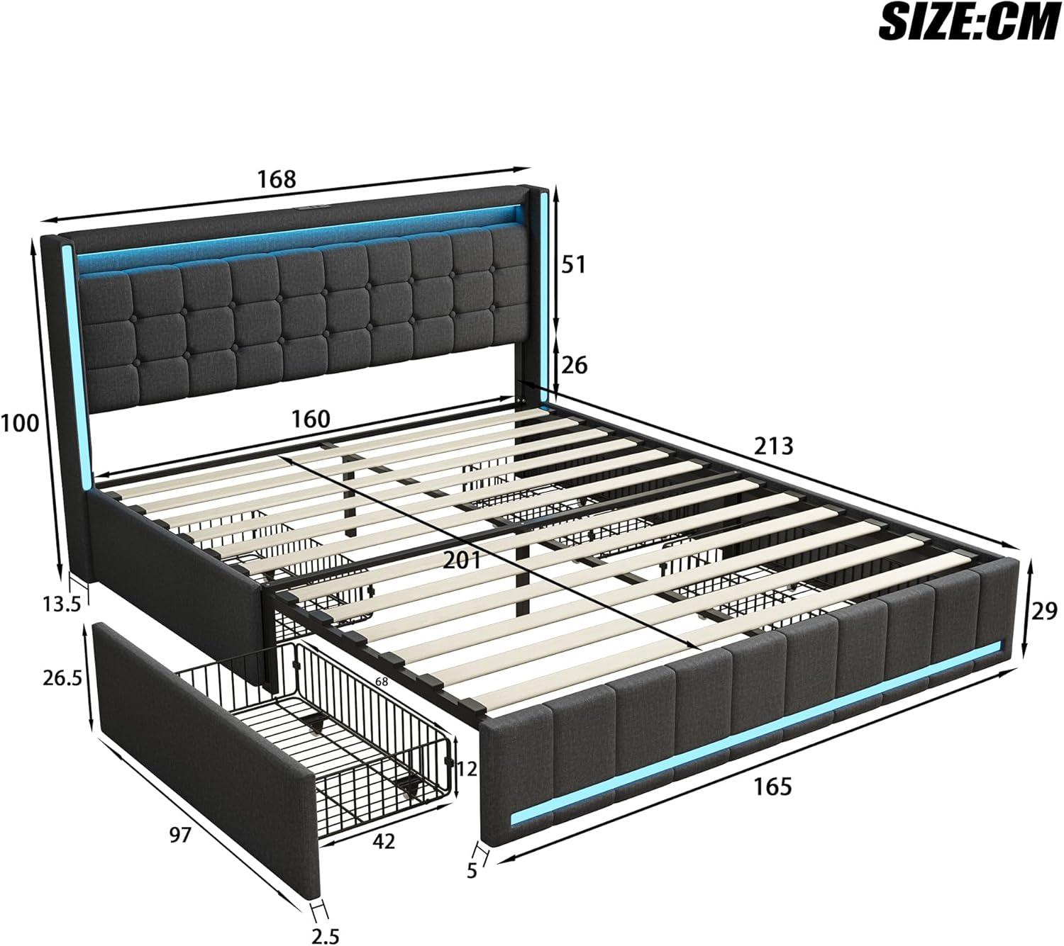 Tapecirani krevet ADFUNIT 160 x 200 cm s LED i USB-om, bračni krevet s 4 ladice, kreveti s prostorom za pohranu i letvičastim okvirom, okvir kreveta s naslonom za mladenački krevet, bez madraca.