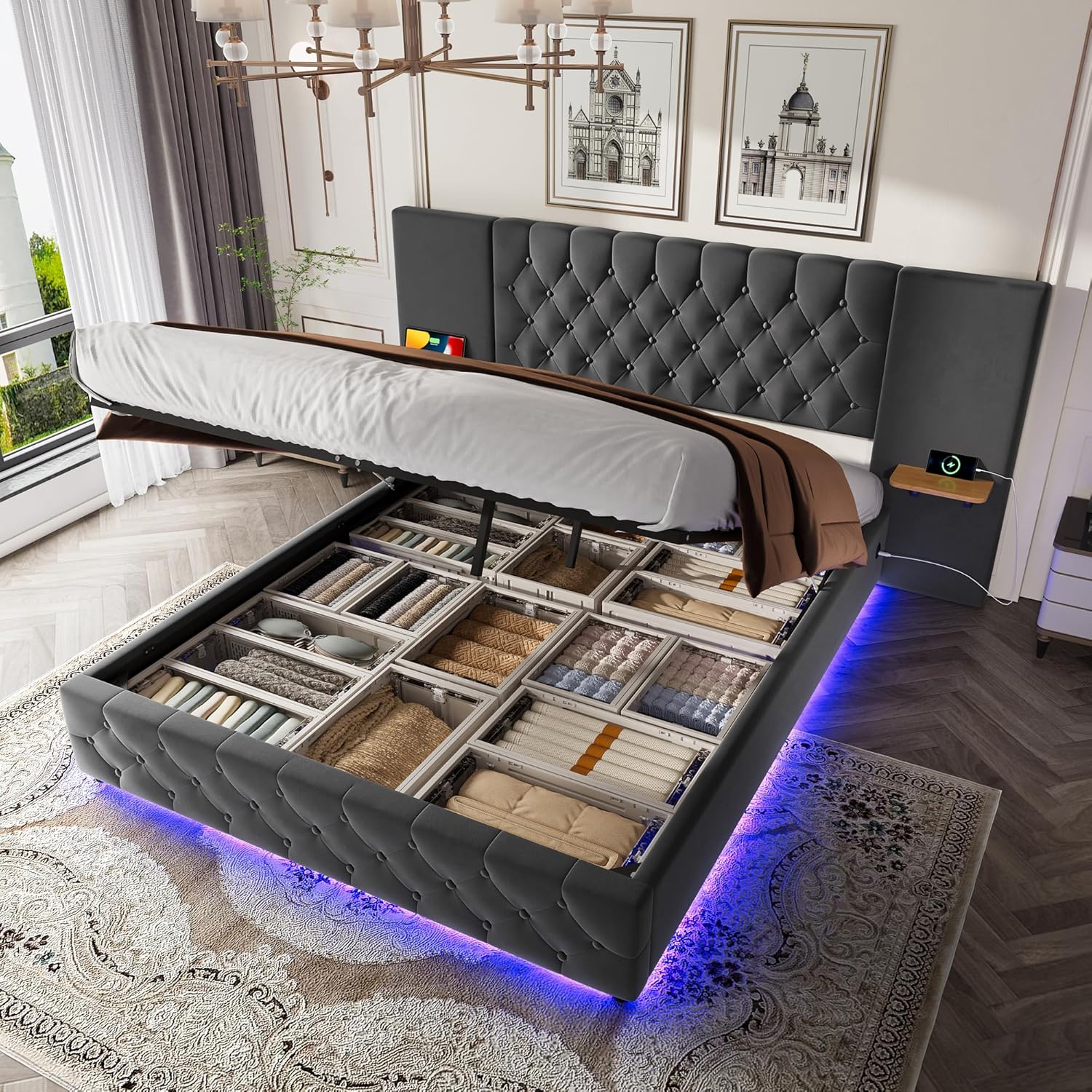 Tapecirani krevet 140 x 200 sa hidrauličnim podizanjem, LED podstavljeni hidraulični krevet s kutijom za pohranu i uzglavljem za 2 osobe.