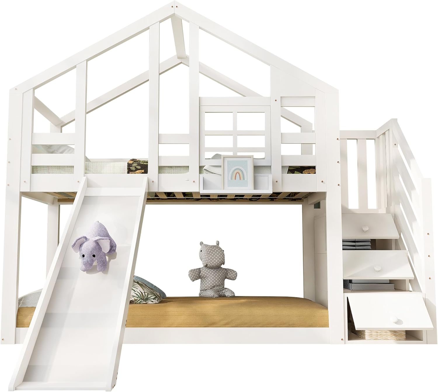 - Inovativni krevet na kat s prostorom za pohranu: Uređivanje dječje sobe često može biti ogroman zadatak, ali ovaj krevet na kat s bijelim drvenim stepenicama je savršen! Svaka stepenica ima ugrađeni ormarić za dodatni, skriveni prostor za pohranu! U dvije ladice ispod kreveta možete pohraniti i veće predmete, poput B. rezervne posteljine.